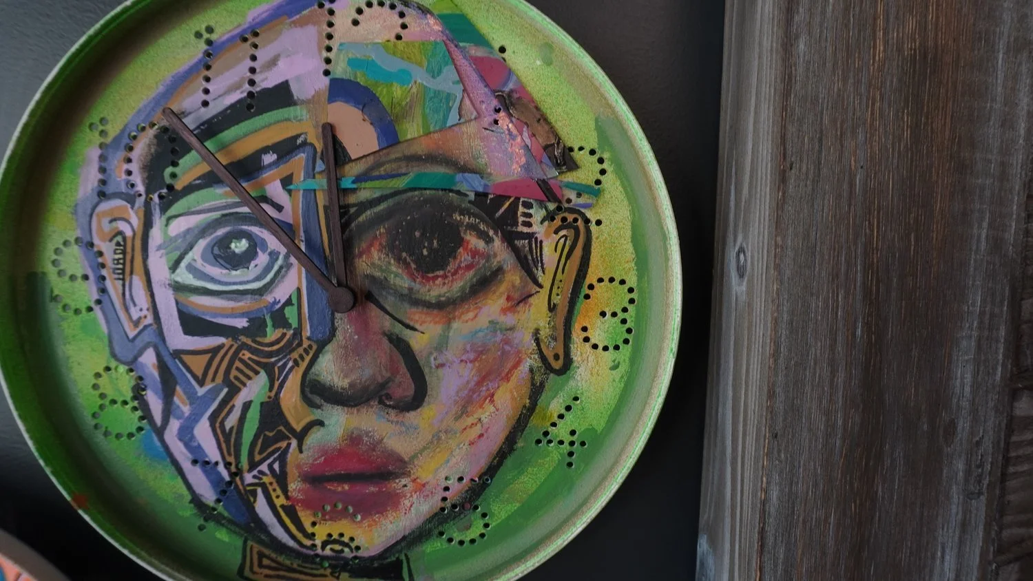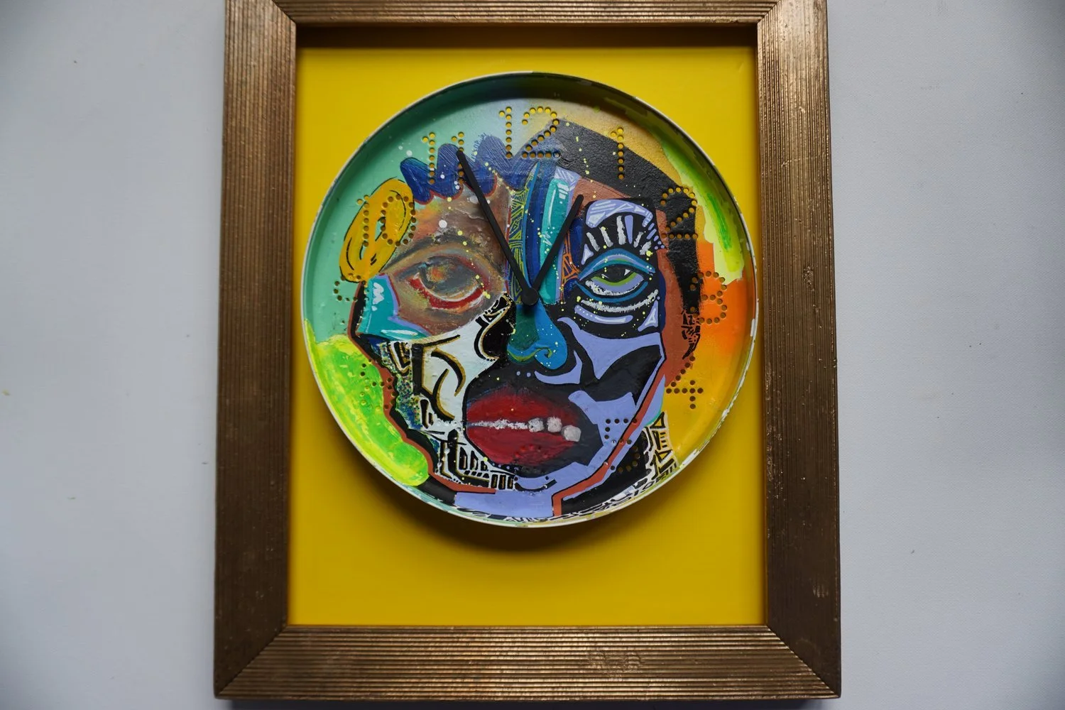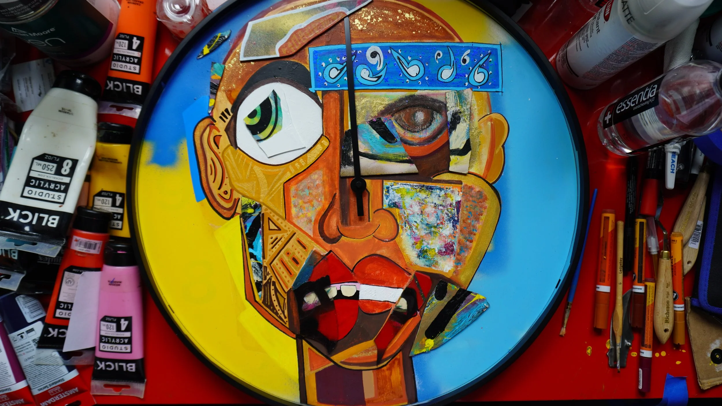 Acrylic paint, oil pastel, and broken glass on functional clock