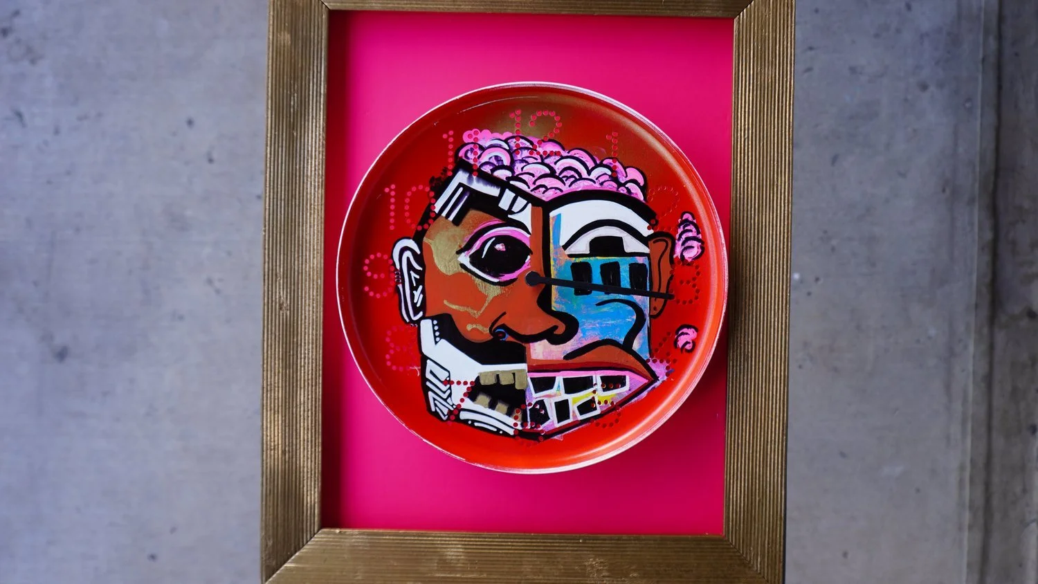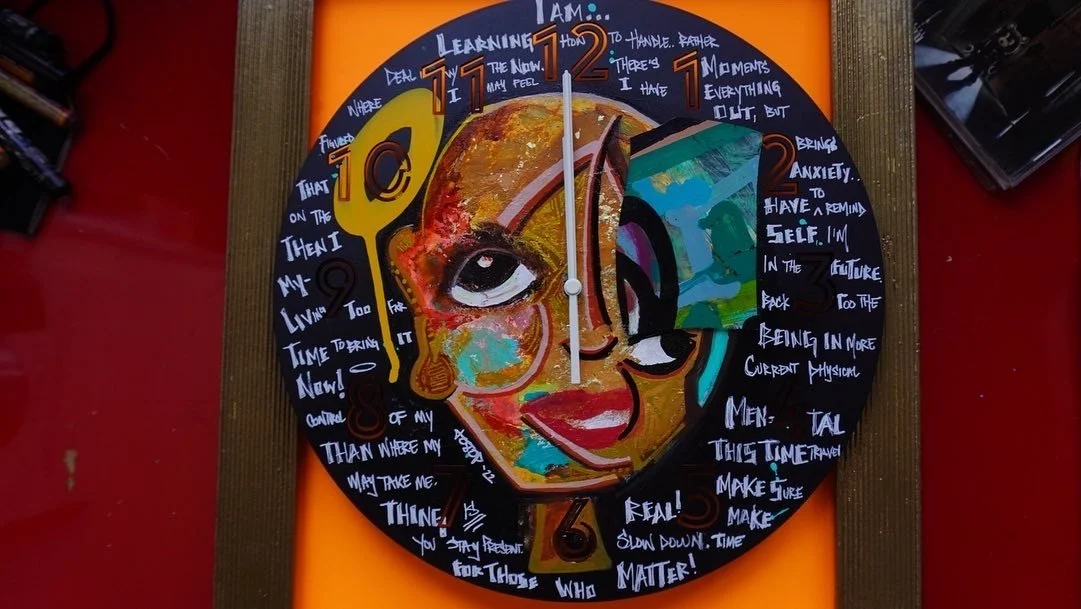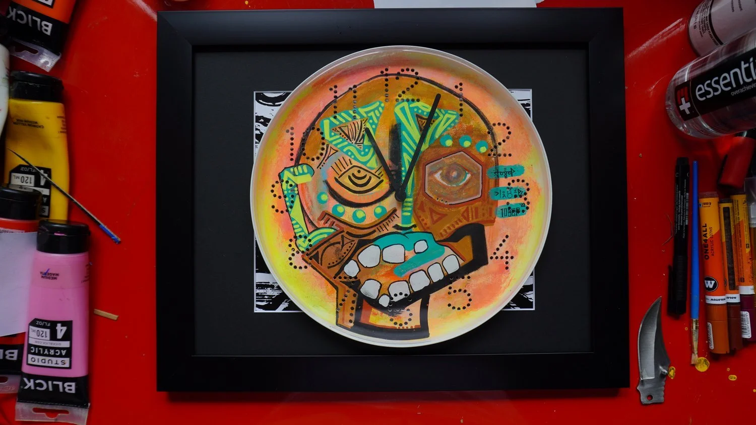 Acrylic paint, oil pastel, and broken glass on functional clock