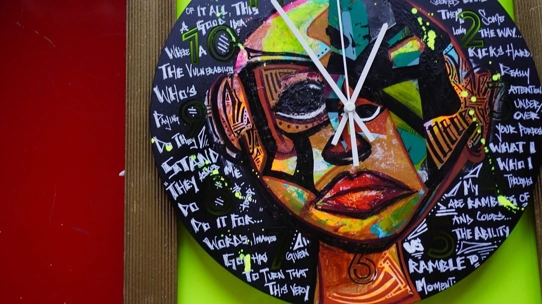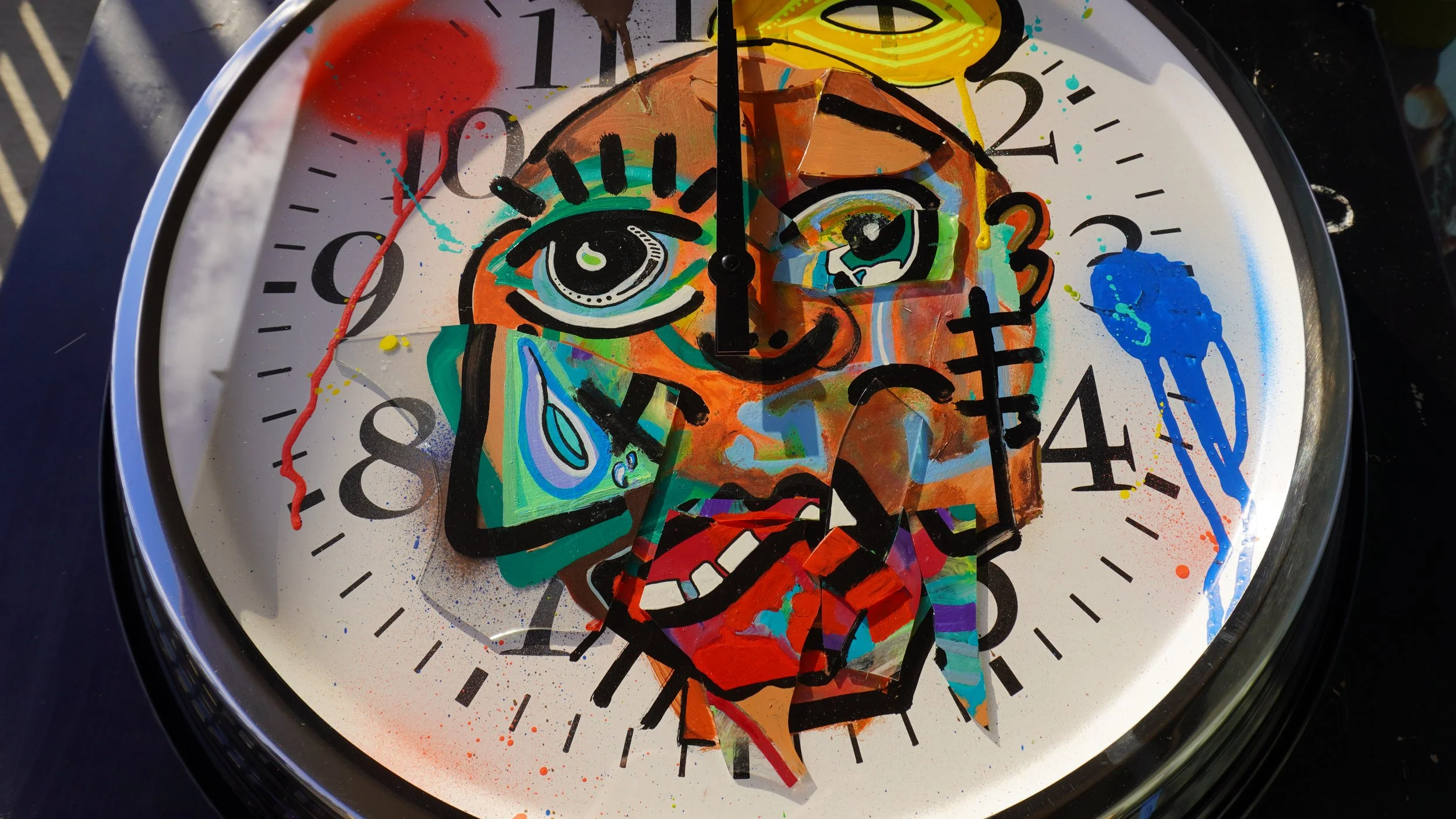 Spray paint, acrylic paint, oil pastels, broken glass on functional clock